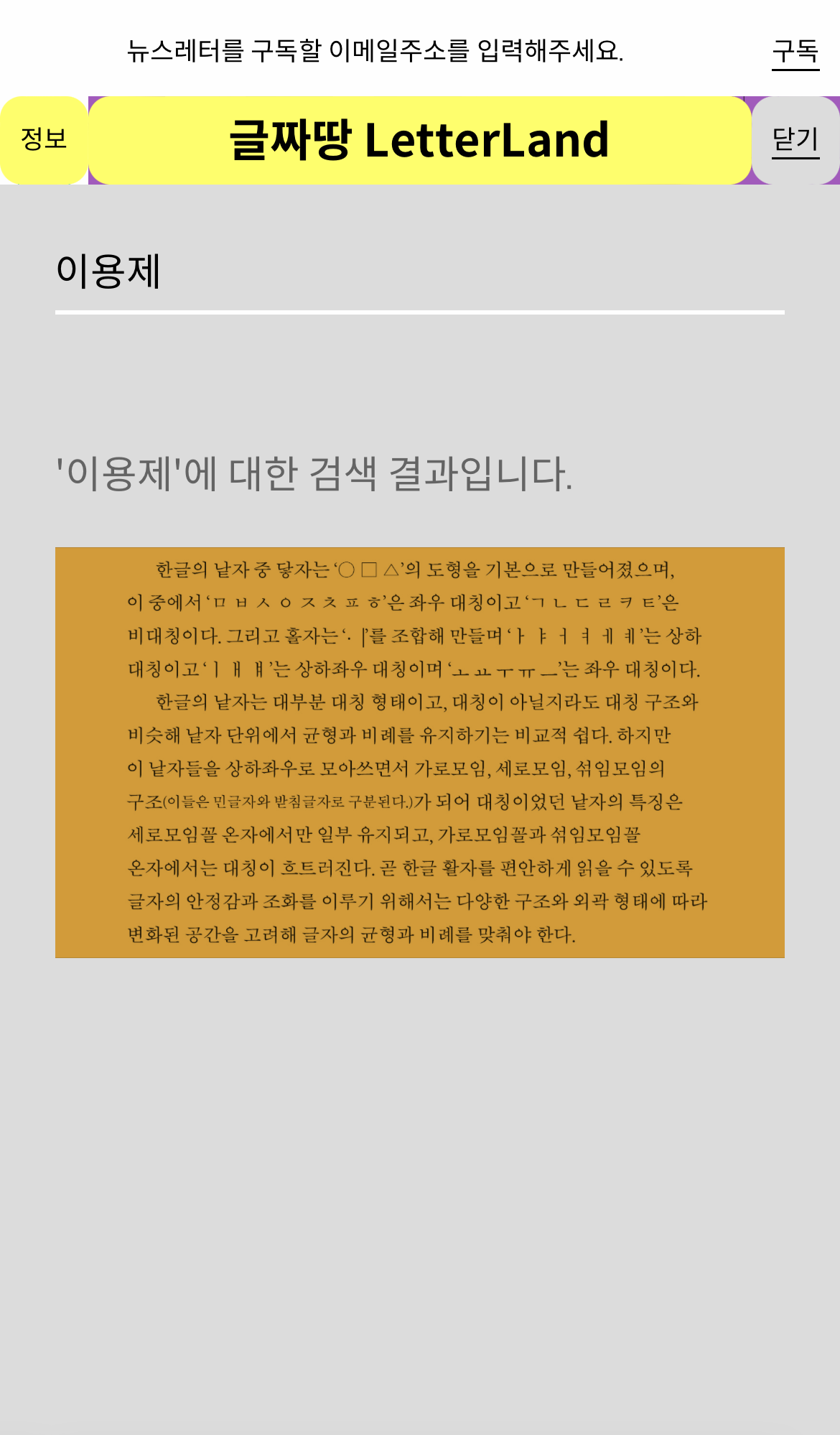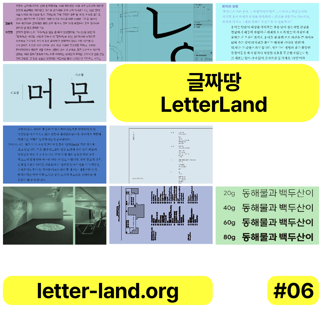 《글짜땅》은 한국타이포그라피학회의 학술지 『글짜씨』의 창간호부터 최근 호까지의 내용을 발췌하여 공유하는 웹사이트입니다. 두 달에 한 번, 10여 페이지를 카드 형태로 업로드하며, 메인화면 상단의 '구독'을 통해 업데이트 사항을 뉴스레터 형식으로 받아볼 수 있습니다.