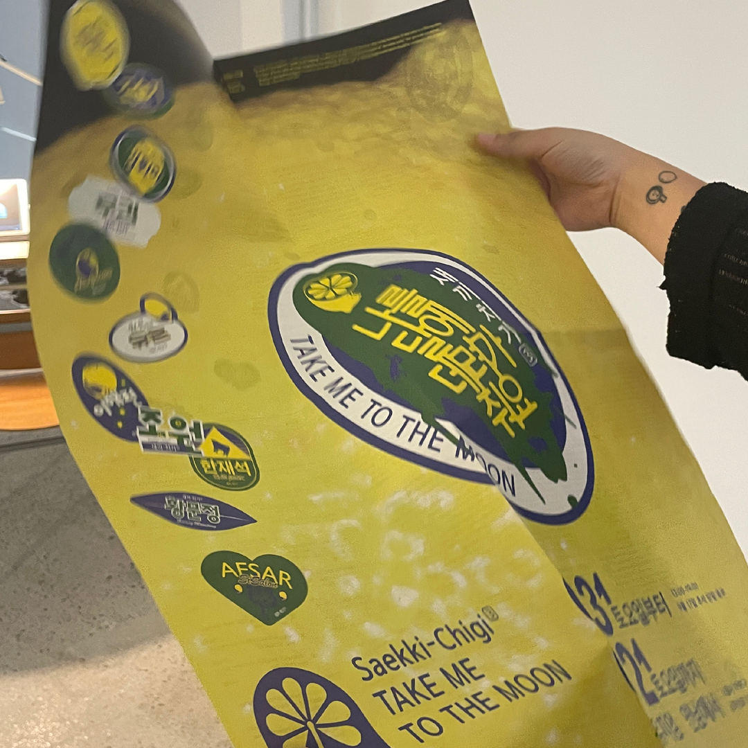 새끼-치기³: 나를 달에 데려가 줘요‘의 디자인을 진행하고 있습니다. 달과 닮은 레몬을 활용하여 울퉁불퉁한 레몬의 표면을 크게 확대하고, 전시와 작가명이 기입된 스티커를 붙여 달에 닿고자 하는 마음을 표현했습니다.